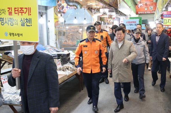 박 시장은 13일 오후 2시 박평재 광명소방서장, 조은순 광명경찰서장과 함께 광명전통시장을 방문해 화재 등 재난을 예방하기 위한 안전 점검을 실시했다.