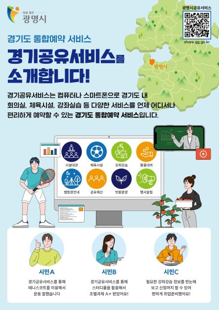 경기공유서비스는 광명시를 비롯한 경기도 내 행정기관과 공공기관의 공공자원을 온라인으로 편리하게 예약해 이용할 수 있는 통합 플랫폼이다.