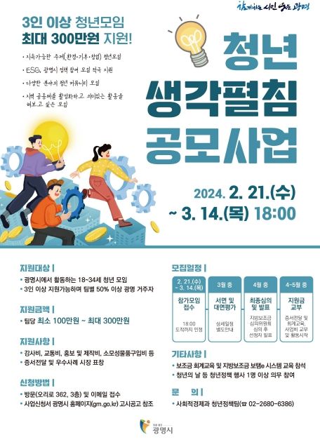 시는 청년 생각펼침 공모사업을 통해 환경·기후·창업 등 지속가능한 주제의 청년 모임을 중심으로 ESG 등 사회문제를 청년의 방식으로 풀어가는 팀, 광명시 정책에 참여할 수 있는 팀을 적극적으로 지원할 예정이다.