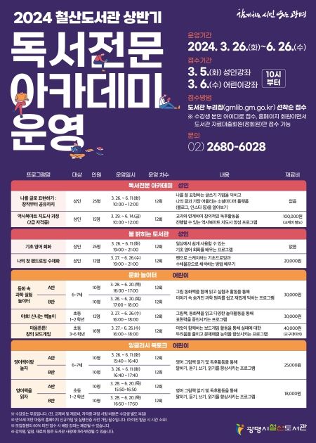 [ 중앙뉴스미디어 ] 광명시 철산도서관은 ‘2024년 상반기 독서전문 아카데미’ 9개 강좌 수강생을 선착순으로 모집한다.