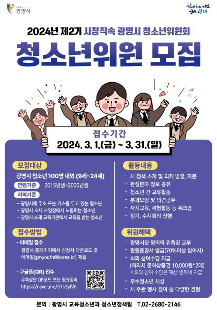 제2기 청소년위원회 위원은 9~24세로 광명시에 거주하거나 교육·근로 활동하는 청소년을 대상으로 총 100명 내외를 3월 31까지 모집한다.