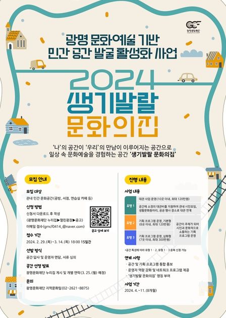 [ 중앙뉴스미디어 ] (재)광명문화재단은 광명 시민 누구나 동네에서 누릴 수 있는 문화공간을 조성하고자 ‘문화예술 기반 민간 공간 발굴 활성화 사업 '생기발랄 문화의집'’에 참여할 민간 공간을 2월 29일부터 3월 14일까지 모집한다.