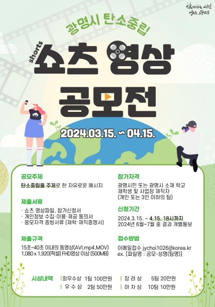 참여 희망자는 15~40초 이내의 세로형 영상 콘텐츠를 제작해 오는 4월 15일까지 참가신청서, 응모자격 증빙서류 등과 함께 이메일로 제출하면 된다. 제출된 쇼츠 샘플은 광명시 유튜브 또는 광명시 누리집(gm.go.kr) 공모전 공고문의 링크를 통해 확인할 수 있다.