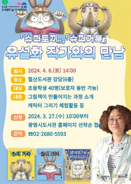 [ 중앙뉴스미디어 ] 광명시 철산도서관은 도서관의 날(4월 12일)과 도서관 주간을 맞아 오는 4월 6일 오후 2시 도서관 6층 강당에서 유설화 그림책 작가와의 만남 행사를 개최한다.