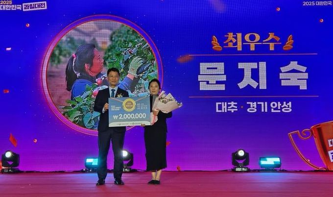 [ 중앙뉴스미디어 ] 농림축산식품부 주최, 한국과수농협연합회 주관으로 하는 ‘2025 대한민국 과일산업대전 대표과일선발대회’에서 안성시가 2023년부터 대추부문에서 최우수상, 우수상을 수상하여 3년 연속 대추부문 최고자리에 올랐다. 수상자로 문지숙 대표가 최우수상(농림축산식품부장관상)으로 선정됐고, 조재곤 대표가 우수상(산림청장상)으로 선정됐다.