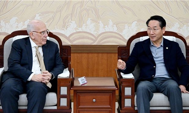 [ 중앙뉴스미디어 ] 유정복 인천시장은 12월 3일 오후 인천시청 접견실에서 세계 최고 수준의 의과·바이오 연구 중심 대학인 존스홉킨스대의 조나단 슈넥(Jonathan schneck) 의과대학 교수(왼쪽) 일행을 접견했다.