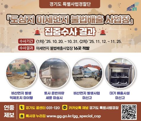 [ 중앙뉴스미디어 ] 경기도는 도심지 미세먼지 발생사업장 330개를 대상으로 불법 배출 행위를 집중 수사해 대기환경보전법 위반 사업장 16개를 적발했다고 9일 밝혔다.