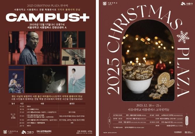 [ 중앙뉴스미디어 ] 시흥시와 서울대학교 시흥캠퍼스가 오는 12월 17일부터 21일까지 특별 행사인 ‘2025 크리스마스 플라자(CHRISTMAS PLAZA)’를 개최한다. 올해 행사는 단 하루만 열리는 전야제 특별콘서트 ‘캠퍼스 플러스’를 중심으로, 국악과 클래식을 대표하는 최정상급 연주자들이 한자리에 모여 연말 분위기를 고조시킬 예정이다.