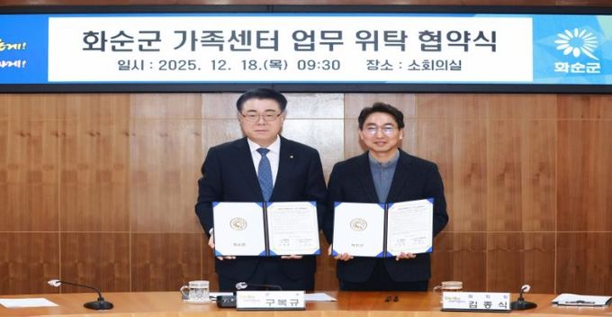 [ 중앙뉴스미디어 ] 화순군은 18일 화순군청 소회의실에서 (사)다사랑건강가정복지협회(회장 김종식)와 화순군 가족센터 업무 위탁 협약을 체결하고, 가족 지원 정책의 안정적 추진과 지역사회 돌봄 기반 확충에 나섰다고 밝혔다.