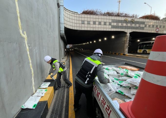 시설관리처는 강설 대응체계 가동과 동시에 인력과 장비를 집중 투입해 지하차도 진출입로와 경사 구간에 염화칼슘 900포를 배치했다.