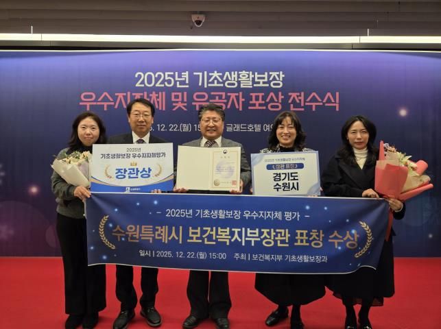 [ 중앙뉴스미디어 ] 수원특례시가 보건복지부 주관 ‘2025년 기초생활보장·긴급지원 사업’ 평가에서 우수 지자체로 선정돼 보건복지부 장관 표창을 받았다. 시상식은 22일 서울 글래드호텔에서 열렸다.