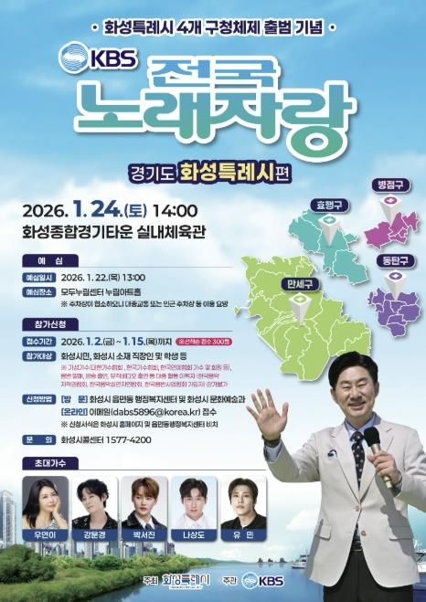 정명근 화성특례시장은 “이번 KBS 전국노래자랑이 함께 즐거운 추억을 만들고 다 함께 즐기는 시간이 되길 바란다”며 “다양한 끼와 재능을 갖춘 시민 여러분의 많은 참여와 관심을 바란다”고 말했다.
