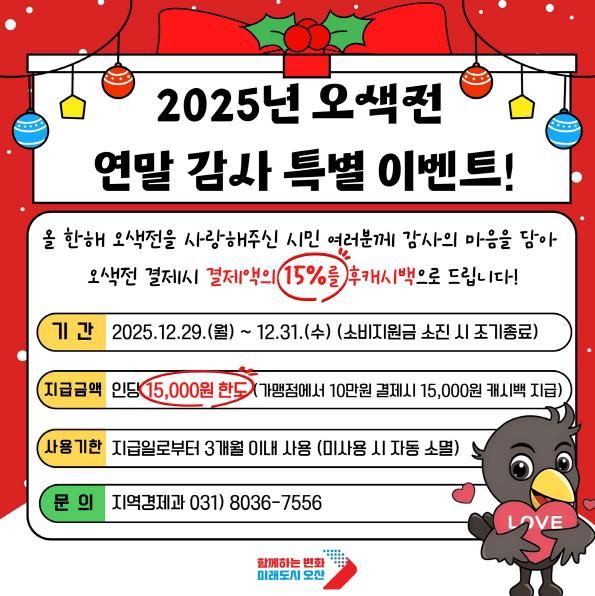 [ 중앙뉴스미디어 ] 오산시는 한 해 동안 지역화폐를 이용해 준 시민들에게 감사의 뜻을 전하고, 연말 소비 활성화를 도모하기 위해 ‘2025년 오색전 연말 감사 특별 이벤트’를 추진한다.