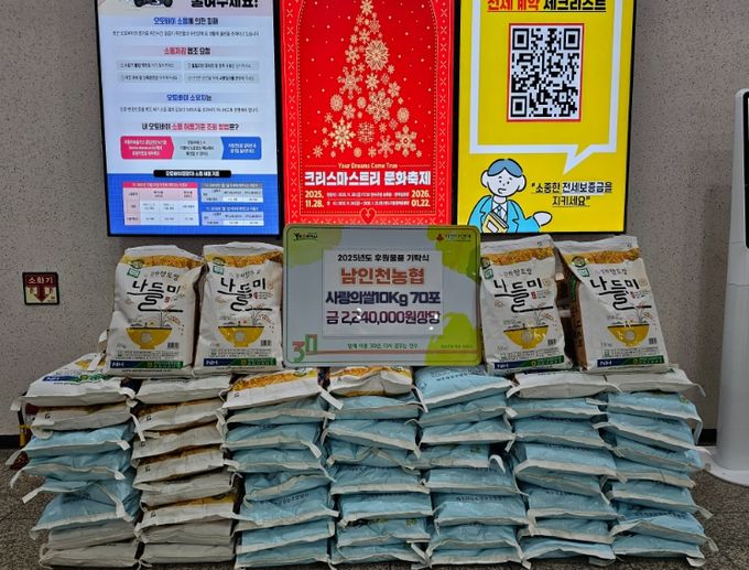 이에 앞서 지난 29일에는 남인천농협(조합장 이태선)이 겨울철 추위와 경제적 어려움으로 이중고를 겪고 있는 소외된 이웃을 돕고, 지역사회 나눔 문화를 확산하기 위해 ‘사랑의 쌀’ 70포(700kg)를 기탁했다.