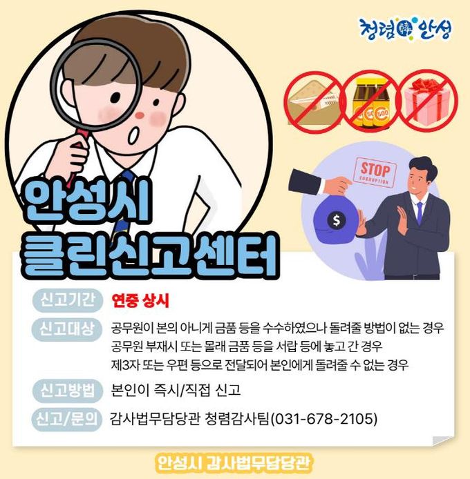 지난해 안성시 클린신고센터에는 6건의 자발적 신고가 접수돼 해당 금품을 반환하거나 복지 대상자에게 기부했으며, 이는 공직사회 내 작은 호의도 경계하는 건전한 조직문화가 정착되고 있음을 보여준다.