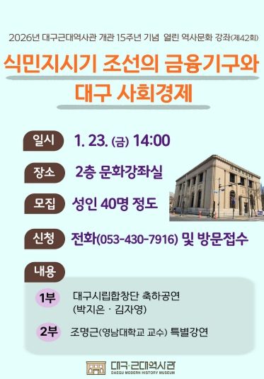 특강은 ‘식민지시기 조선의 금융기구와 대구 사회 경제’를 주제로 조명근 영남대 교수가 진행한다. 조명근 교수는 근대 경제사 전문가로, 강의는 조선식산은행을 비롯한 근대 금융기구를 통해 식민지 조선과 대구 사회·경제에 대해 폭넓게 이해하는 시간이 될 것으로 기대된다.