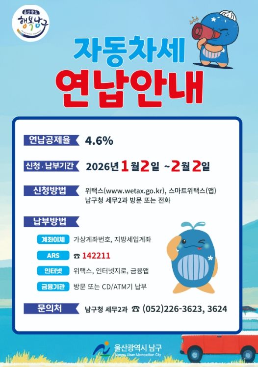 [ 중앙뉴스미디어 ] 울산 남구는 오는 2월 2일까지 올해 1월 자동차세 연납 신청을 접수한다고 밝혔다.
