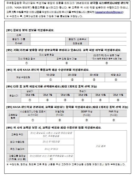 이번 활용 교육은 현장의 요청과 함께 우주청 개청 이후 지속해 온 '민간 역량 강화를 통한 위성산업 자립화'를 위한 기업 지원의 일환으로 기획되어 기업을 직접 방문하여 현장 맞춤형으로 실시한다. 교육대상 선정을 위한 수요조사는 1월 19일부터 31일까지 실시하여 기업에 소속된 핸드북 신청자에게 수요조사서를 송부하고 핸드북 전담 이메일로 접수를 받는다.