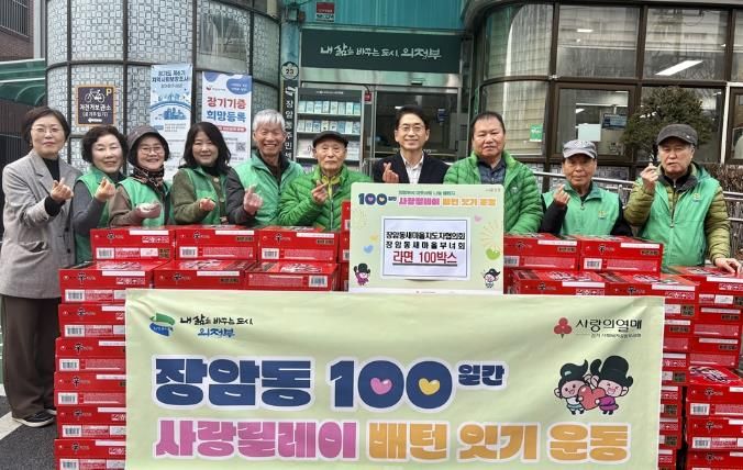 [ 중앙뉴스미디어 ] 의정부시 장암동주민센터는 1월 15일 장암동 새마을지도자협의회·새마을부녀회가 겨울철 어려운 이웃들을 위해 라면 100상자를 전달하며 ‘100일간 사랑릴레이 배턴 잇기’에 동참했다고 밝혔다.