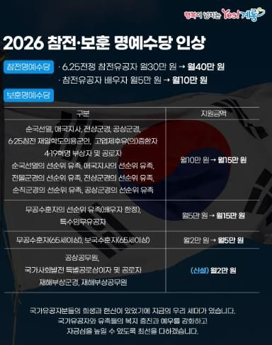 특히 2026년부터는 공상공무원, 국가사회발전 특별공로상이자 및 공로자, 재해부상군경, 재해부상공무원에게도 보훈명예수당을 신설해 월 2만 원을 지급할 예정이다.