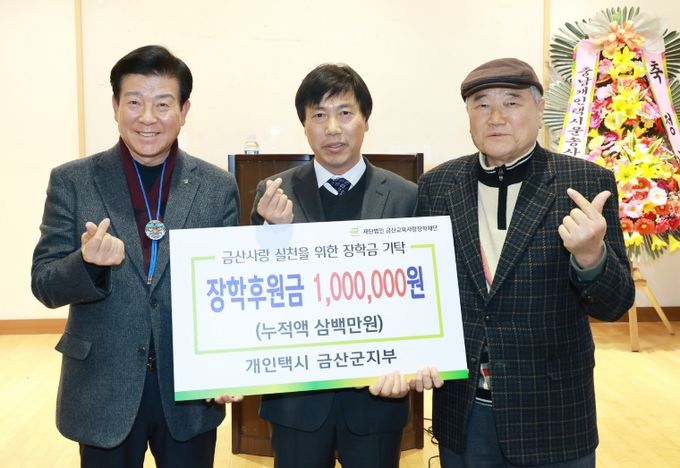 박범인 금산군수는 “지역 경제가 어려운 상황에서도 따뜻한 마음을 전해주신 개인택시 금산군지부에 감사드린다”며 “기부금은 학생들의 학업 지원과 장학사업에 소중히 사용해 학생들이 더 큰 꿈을 펼칠 수 있도록 돕겠다”고 전했다.