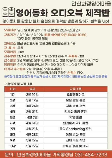 [ 중앙뉴스미디어 ] 안산시가 설립하고 안산대학교가 운영하는 안산화정영어마을이 성인 영어 학습자를 위한 ‘영어동화 오디오북 제작반’을 3월부터 5월까지 10주 과정으로 안산시 중앙도서관에서 운영한다고 4일 밝혔다.