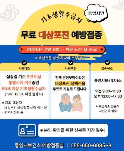 통영시 무료 대상포진 예방접종 사업은 접종일 기준 통영시에 2년 이상 주민등록을 둔 65세 이상(1961. 12. 31. 이전 출생자) 기초생활수급자 200명을 대상으로 생백신 1회 접종을 지원하며, 면역저하자 등 백신 금기자 및 과거 대상포진 예방접종 이력이 있는 시민은 대상에서 제외된다.