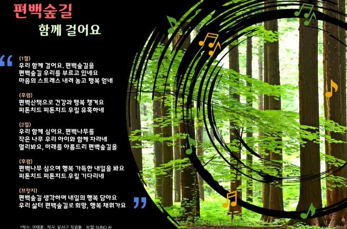 후렴구에는 ‘편백산책으로 건강과 행복 챙겨요’, ‘피톤치드 우릴 유혹하네’라는 메시지를 경쾌한 리듬에 담아, 편백숲이 주는 상쾌함과 치유의 가치를 자연스럽게 전달한다.