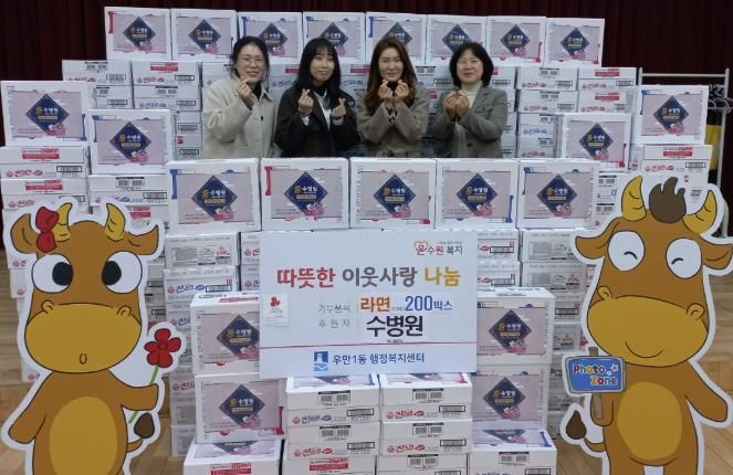 [ 중앙뉴스미디어 ] 수병원은 지난 4일, 설 명절을 맞아 어려운 이웃들을 위해 라면 200박스를 우만1동 행정복지센터에 기부하며 이웃사랑을 실천했다.