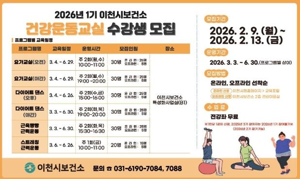 운동교실 참여를 원하는 시민은 2월 9일부터 13일까지 이천시 누리집(홈페이지) 교육포털 시스템에서 신청하면 된다.