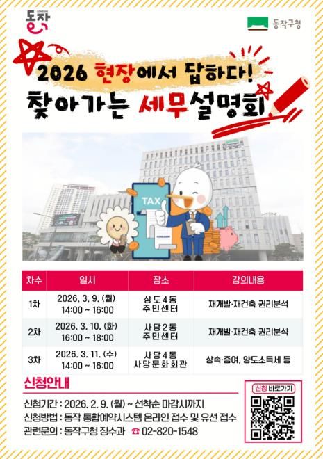 [ 중앙뉴스미디어 ] 동작구가 재개발·재건축이 활발히 진행되는 구 특성을 반영해 ‘2026 현장에서 답하다! 찾아가는 세무설명회’를 개최한다고 밝혔다.