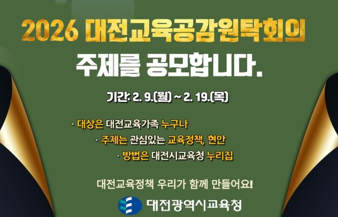 [ 중앙뉴스미디어 ] 대전시교육청은 교육정책에 대한 교육공동체의 다양한 의견을 수렴하고 소통 중심의 교육행정을 실현하기 위해, 2월 9일부터 19일까지 11일간‘2026년 대전교육공감원탁회의' 토론 주제를 공모한다고 밝혔다.