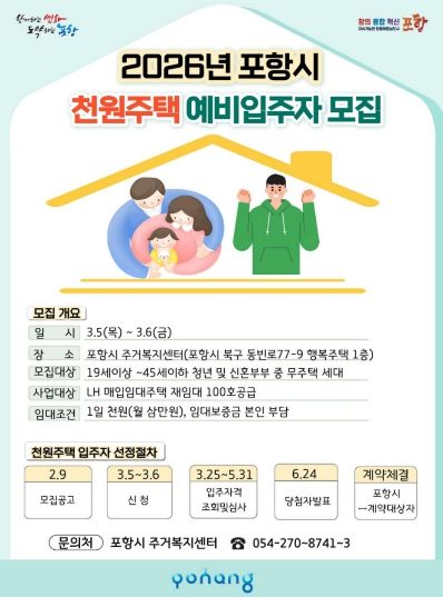 한편, 자세한 문의사항은 포항시 주거복지센터를 방문하거나 전화로 문의하면 안내받을 수 있다.