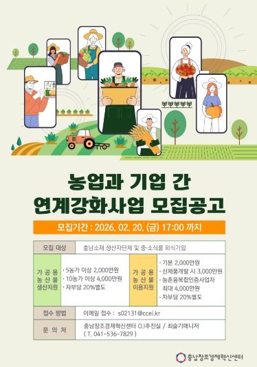 [ 중앙뉴스미디어 ] (재)충남창조경제혁신센터는 ‘2026년 농업과 기업 간 연계강화 지원사업’ 참여 대상을 모집한다고 밝혔다.