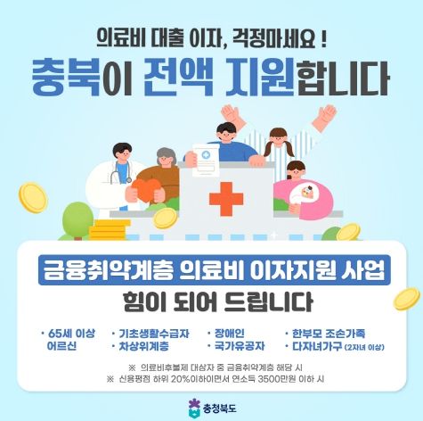 [ 중앙뉴스미디어 ] 충북도는 의료 사각지대 해소를 위해 ‘금융취약계층 의료비 이자 지원사업’을 2월 11일부터 시행한다.