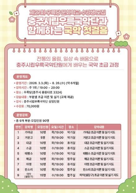 [ 중앙뉴스미디어 ] 충주시립우륵국악단은 ‘제27회 우륵당 문화학교’를 오는 3월부터 8월까지 약 6개월 간 운영한다고 19일 밝혔다.
