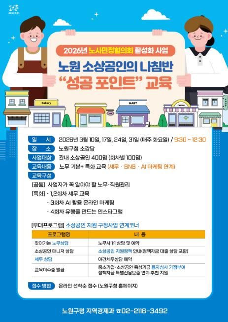교육은 3월 10일, 17일, 24일, 31일 총 4회에 걸쳐 노원구청 6층 소강당에서 진행된다. 지역 내 소상공인이라면 누구나 참여할 수 있으며, 회차별 약 100명 내외로 선착순 모집한다. 참여 신청은 노원구청 홈페이지를 통해 가능하며, 모집 인원 충원 시 조기 마감된다.