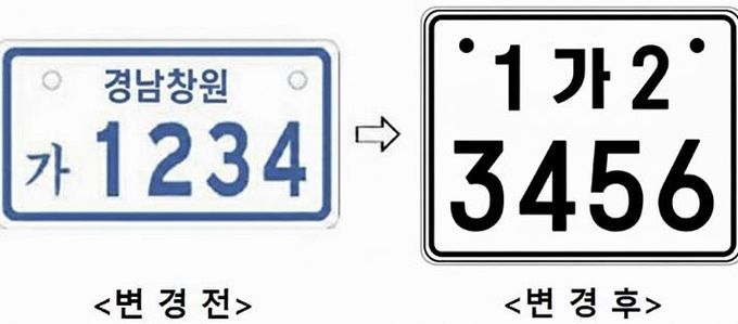 전국번호판은 크기를 기존 ‘가로210㎜×세로115㎜’에서 ‘가로210㎜×세로150㎜’로 확대해 시인성을 개선하고, 글자 색상도 기존 파란색에서 검정색으로 변경해 식별성을 높였다. 또한 ‘경남 창원’ 등 지역명 표기를 삭제하고 전국 단일 번호체계를 적용한다.