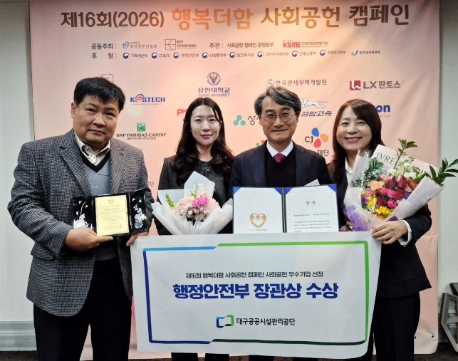 [ 중앙뉴스미디어 ] 대구공공시설관리공단이 지난 2월 26일 (사)한국언론인협회와 (사)한국경영자총협회가 공동 주최하는 ‘2026 행복더함 사회공헌 캠페인’에서 우수기업으로 선정되어 행정안전부 장관상을 수상했다.