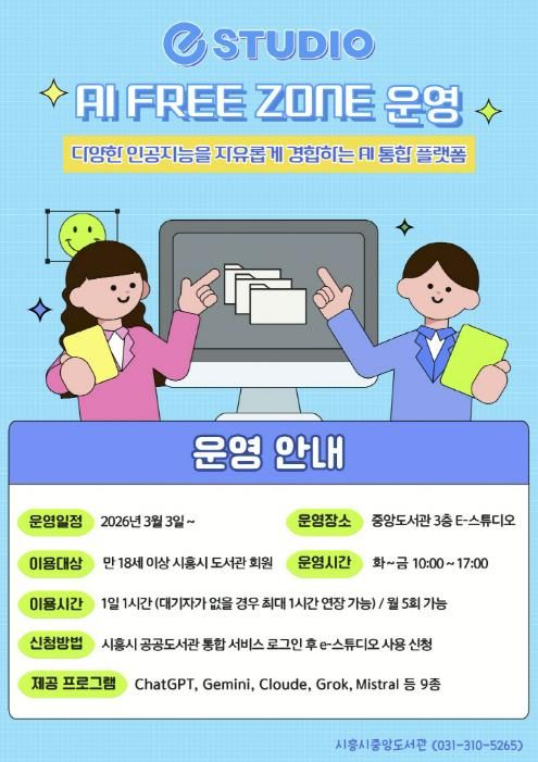 [ 중앙뉴스미디어 ] 시흥시중앙도서관은 시민들의 인공지능(AI) 활용 역량 강화를 위해 시 정보통신과와 협업해 도서관 3층 e-스튜디오에 ‘인공지능(AI) 프리 존(Free Zone)’을 구축하고, 오는 3월 3일부터 본격 운영에 들어간다.