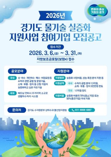 [ 중앙뉴스미디어 ] 경기도가 ‘2026년 경기도 물기술 실증화 지원사업’ 참여 기업을 공개 모집한다.