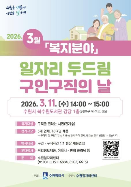 [ 중앙뉴스미디어 ] 수원특례시는 3월 11일 오후 2시부터 3시까지 북수원도서관 강당에서 ‘3월 일자리 두드림 구인·구직의 날’을 개최한다.
