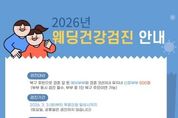 [ 중앙뉴스미디어 ] 대구 북구보건소(소장 이영숙)는 오는 3월 3일부터 예비(신혼)부부의 건강한 출발을 지원하기 위해 '2026년 웨딩건강검진사업'을 시행한다. 검진 대상은 북구 주민 중 결혼을 앞둔 예비부부와 결혼 3년 이내 무자녀 신혼부부다. 부부 중 1인이 북구 주민이면 신청할 수 있으며, 검진은 부부 두 사람이 함께 받아야 한다. 특히 올해는 최근 혼인 증가 추세와 높은 주민 호응을 반영해 검진 인원을 500명으로 확대 운영한다. 검사 항목은 풍진, B형간염, 성매개감염병, 간 기능, 지질검사, 결핵(X선) 등 총 19종이며, 검진을 희망하는 주민은 정부24 또는 북구보건소 홈페이지를 통해 사전 예약 후 보건소를 방문하면 된다. 검진 결과는 공공보건포털 e보건소를 통해 본인이 직접 확인할 수 있으며, 유소견자의 경우 건강상담을 진행하고 정밀검사, 치료, 예방접종, 임신․출산 지원 정책 등 맞춤형 정보를 연계 제공한다. 또한 사업 관련 문의 증가에 대응하기 위해 24시간 이용할 수 있는 온라인 안내 체계를 구축했다. 검진 절차, 준비 서류, 예약 방법, 결과 확인 등 주요 정보를
