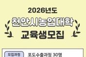 [ 중앙뉴스미디어 ] 천안시농업기술센터는 내달 6일까지 ‘2026년도 천안시농업대학’ 교육생 30명을 모집한다고 23일 밝혔다. 천안시농업대학은 시의 농업을 선도할 신지식 농업인 양성을 목표로 운영되고 있으며, 현재까지 18기 35개 과정을 통해 1,139명의 졸업생을 배출했다. 올해는 포도 수출 확대와 경쟁력 강화를 위해 ‘포도수출 과정’을 개설·운영할 예정이다. 모집 대상은 천안시에 주소를 둔 농업인 또는 농업 종사 예정자로, 입학원서는 센터에 방문하거나 전자우편을 통해 제출하면 된다. 자세한 사항은 센터 교육운영팀으로 문의하면 된다. [뉴스출처 : 충청남도천안시]