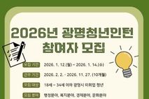 [ 중앙뉴스미디어 ] 광명시가 오는 12일부터 14일까지 ‘2026년 상반기 청년 일자리 사업’ 참여자 103명을 모집한다. 청년 일자리 사업은 공공 및 유관기관에서 실무 경험 기회를 제공해 청년의 사회진출과 진로 탐색을 지원한다. 이번 사업은 ▲광명청년인턴 ▲청년성장 등 2개 유형으로 운영하며, 총 103명의 청년을 선발할 예정이다. 유형별 모집 인원은 광명청년인턴 55명, 청년성장 48명이다. 광명청년인턴은 공고일(2026.1.1.) 기준 광명시에 주민등록이 되어 있는 18세 이상 34세 이하(1991.1.2.~2008.1.1. 출생자)의 미취업 청년이, 청년성장은 18세 이상 39세 이하(1986.1.2.~2008.1.1. 출생자)의 미취업 청년이 신청할 수 있다. 참여를 원하는 청년은 잡아바 어플라이에서 온라인 신청하면 된다. 최종 선발 결과는 오는 1월 27일에 발표할 예정이다. 근무 기간은 광명청년인턴의 경우 2월 2일부터 11월 27일까지 약 10개월간, 청년성장은 2월 2일부터 6월 26일까지 약 5개월간이다. 근무 조건은 주 5일, 하루 7시간 근무이며 월 급여는 180
