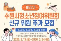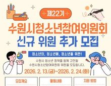 [ 중앙뉴스미디어 ] 수원시청소년청년재단(이사장 최종진)은 수원시 청소년의 정책 참여 확대와 권익 증진을 위해 '제22기 수원시청소년참여위원회' 위원을 추가 모집한다고 밝혔다. 수원시청소년참여위원회는 청소년기본법5조의2(청소년자치권의 확대)에 따라 청소년이 직접 정책 제안과 의견 개진에 참여하며 청소년 정책의 실효성을 높이기 위해 운영되는 공식 참여기구이다. 이번 추가 모집은 수원시에 거주하는 9세부터 24세까지의 청소년을 대상으로 하며 총 20명 내외를 선발할 예정이다. 활동 기간은 2026년 3월부터 12월까지이며 주요 활동 내용은 △수원시 청소년 정책 제안‧발굴 및 자문 △정책 관련 전문교육 참여 △청소년축제 기획 및 운영 △경기도 청소년참여위원회 및 관내 참여기구 교류 활동 등이다. 참여위원회 위원에게는 수원시장 명의의 위촉장이 수여되며 활동에 따라 봉사시간도 부여된다. 모집 기간은 2026년 2월 13일부터 2월 24일까지이며 신청은 재단 홈페이지 또는 수원시청소년청년재단 경영지원실로 문의하면 된다.