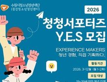 [ 중앙뉴스미디어 ] 수원시청소년청년재단 권선청소년청년센터는 청년이 문화 프로그램의 기획과 운영 과정에 주도적으로 참여하며 또래 간 네트워크를 형성하고, 이를 통해 지역사회에 긍정적인 에너지를 확산할 수 있도록 돕는 '2026 청청서포터즈 YES(Youth Energy Supporters)' 참가자를 모집한다. '청청서포터즈 YES’는 청년을 단순 참여자가 아닌 기획자이자 실행 주체로 세워 문화·진로·네트워크 분야 프로그램을 직접 기획하고 운영하는 참여형 활동이다. 활동 과정에서 청년들은 아이디어를 구체화하고 실행해보는 경험을 통해 기획 역량을 키우고, 또래 청년들과의 협업을 통해 실질적인 네트워크를 구축하게 된다. 활동은 2026년 3월부터 12월까지 총 15회 운영되며, 모집 대상은 19~39세 청년 15명이다. 참가 신청은 3월 14일까지 온라인을 통해 가능하며, 자세한 사항은 권선청소년청년센터로 문의하면 된다. 센터 관계자는 “청년의 에너지가 지역의 변화로 이어질 수 있도록 실질적인 참여 기회를 마련했다”며 “청년들이 스스로 기획하고 실행하는 과정을 통해 한 단계 성장하는 계기가 되길 기대한다”고