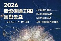 [ 중앙뉴스미디어 ] (재)화성시문화관광재단은 화성특례시 지역 예술인의 안정적인 창작 활동과 지속 가능한 예술생태계 조성을 위해 오는 1월 28일부터 '2026 화성예술지원' 통합공모를 실시한다. '2026 화성예술지원'은 화성특례시의 지역적 특성과 예술환경을 반영하여 ▲화성예술활동지원, ▲경기예술활동지원 ‘모든예술31 화성’, ▲신진예술인 지원, ▲장애·다문화 예술인 특화지원, 총 4개 분야로 구성된 통합 예술지원사업이다. 본 사업은 화성특례시 전문예술인(단체)을 주요 대상으로 하며, ‘모든예술31 화성’ 분야의 경우 경기도 소재 전문예술인(단체)도 신청할 수 있다. 총 지원 규모는 7억 2,500만원이다. 이번 공모는 공연예술, 시각예술, 문학, 다원예술 등 다양한 예술 장르를 포괄하며, 사업별 지원 목적과 내용에 따라 개별 프로젝트당 400만 원에서 최대 2,000만 원까지 차등 지원한다. 세부 지원 내용과 신청 자격, 일정 등은 화성시문화관광재단 홈페이지를 통해 확인할 수 있다. 공모 신청은 재단 홈페이지 공고에 게시된 지원안내서를 참고하여 사업계획서 및 필수 제출서류를 구비한 후 온라인으로 접수하면 된