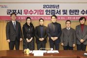 [ 중앙뉴스미디어 ] 군포시는 17일 시청 3층 중회의실에서 ‘2025년 군포시 우수기업 인증서 및 현판 수여식’을 열고 5개 우수기업에 인증서와 현판을 수여했다. ‘우수기업 선정사업’은 2022년부터 시작하여 올해 4번째로 추진하는 사업으로 일자리 창출, 세수 증대 등 지역경제 활성화에 기여한 기업을 선정하여 인센티브를 부여하는 사업이다. 선정된 우수기업은 인증기간(3년) 동안 군포시 중소기업 육성자금 지원 시 추가 이차보전, 군포시 관내 공영주차장 이용 시 주차요금 감면, 협약병원 의료비 지원 등의 인센티브가 부여된다. 하은호 군포시장은 “어려운 경제 상황 속 관내 우수한 기업에 활력을 불어넣기 위한 우수기업 선정사업에 관심 가져주심에 감사드리며, 앞으로도 기업지원 사업을 다각화하여 기업 경영하기 좋은 환경을 만들겠다”고 말했다. 올해 선정된 군포시 우수기업은 △(주)아이씨에이치 △㈜지비티코리아 △주식회사예선테크 △듀라텍 주식회사 △㈜트리플닷 으로 총 5개 기업이다.