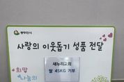 [ 중앙뉴스미디어 ] 동두천시 불현동 새누리교회는 11월 3일 불현동 행정복지센터에 백미 45kg을 전달했다고 밝혔다. 새누리교회는 불현동에 위치한 개신교 교단으로, 매년 나눔을 실천하며 지역사회에 따뜻한 온정을 나누고 있다. 민경엽 담임목사는 “지역의 소외된 이웃들이 추운 겨울 따뜻한 연말을 보낼 수 있길 바란다”며 “작은 정성이지만 도움이 됐으면 좋겠다”라고 전했다. 김영미 불현동장은 “지역사회를 위해 꾸준히 나눔을 실천해 주신 데 감사드리며, 후원해 주신 백미는 도움이 필요한 취약계층에 소중히 전달하겠다”라고 말했다.